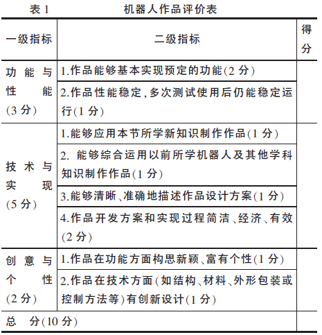 对学生自主搭建的机器人作品进行评价,可以从机器人作品的功能与性能、技术与实现、创意与个性等方面进行评价。例如笔者在开发高中“开源硬件项目设计”教材中使用的作品评价表,见表1。