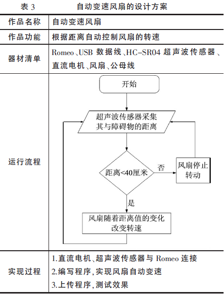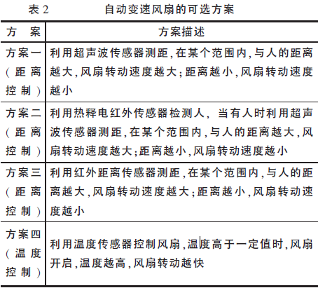 通过需求分析,学生可以从距离控制和温度控制两个角度出发设计智能风扇,形成可能的初步方案,见表2。