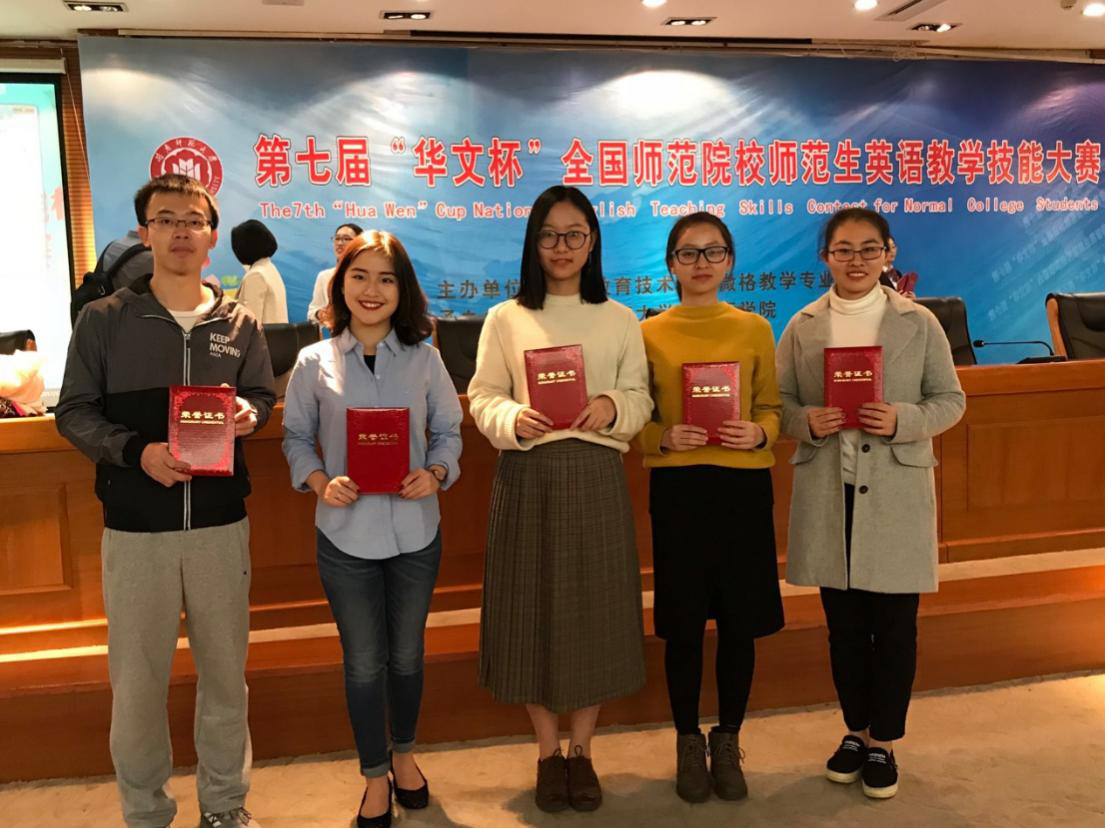 (当代师范生讯)2017年12月31日,第七届“华文杯”全国师范院校师范生英语教学技能大赛在闽南师范大学落下帷幕。我校外国语学院向宗平老师带领3名本科生和2名教育硕士参赛,取得骄人成绩。其中邓舒予获得特等奖、纪力源获得一等奖、郑涌和陈小青获得二等奖2项,丁娅获得三等奖。特等奖获得者邓舒予同学在闭幕式上作了精彩的教学展示,赢得全场师生一致好评。