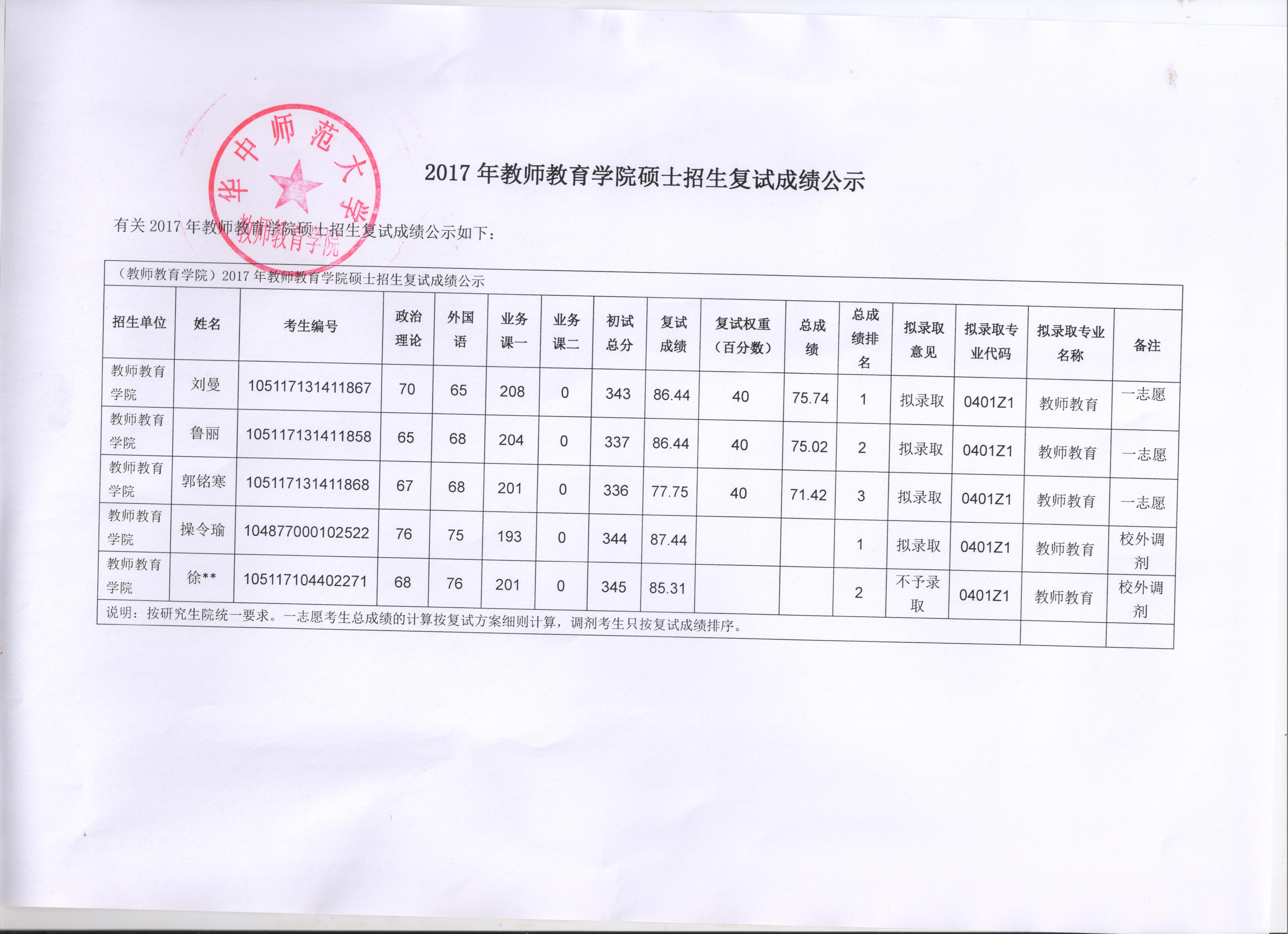 2017年硕士招生复试成绩公示